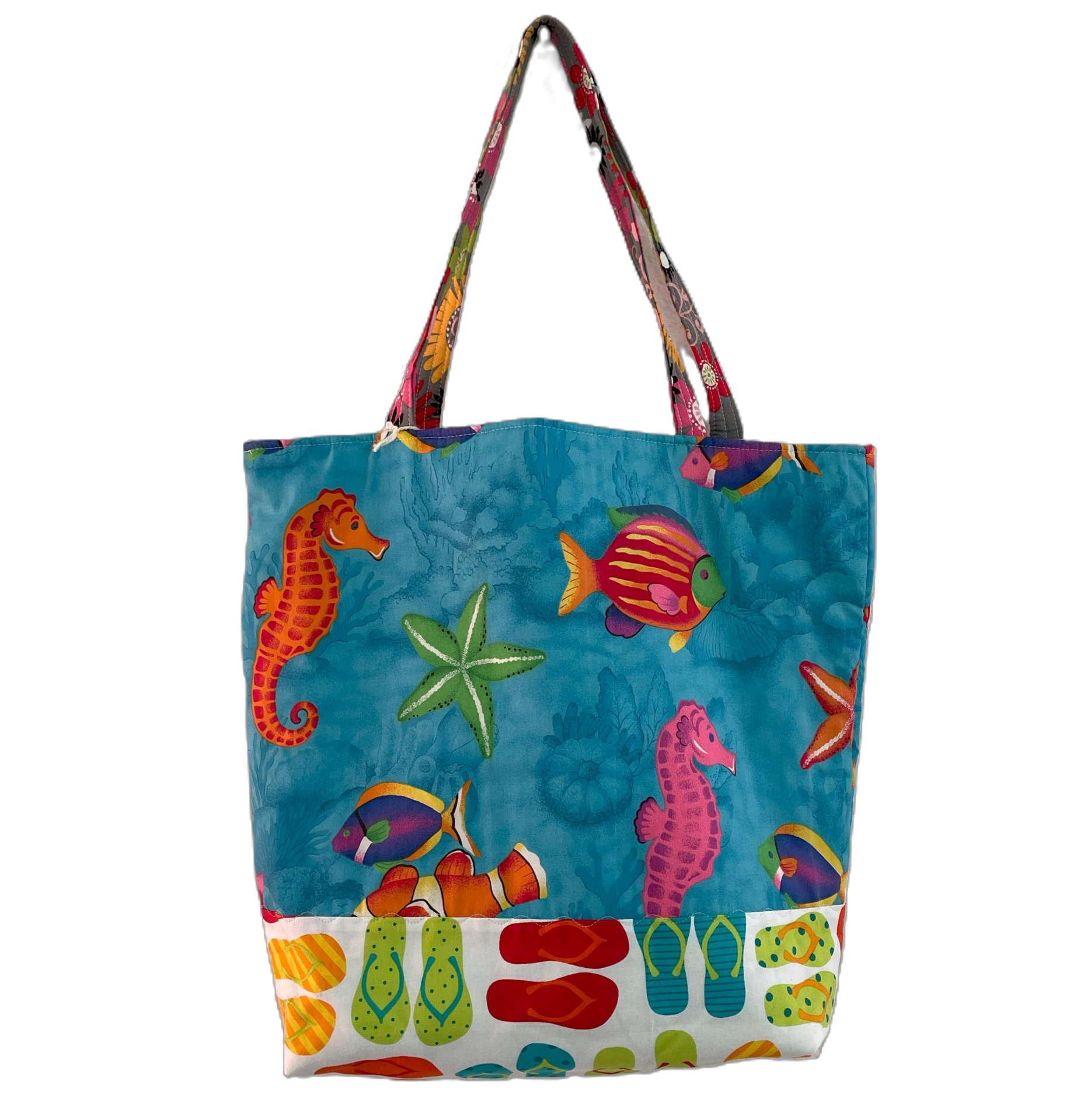 Hermosa bolsa hecha con tela con imágenes de playa.
