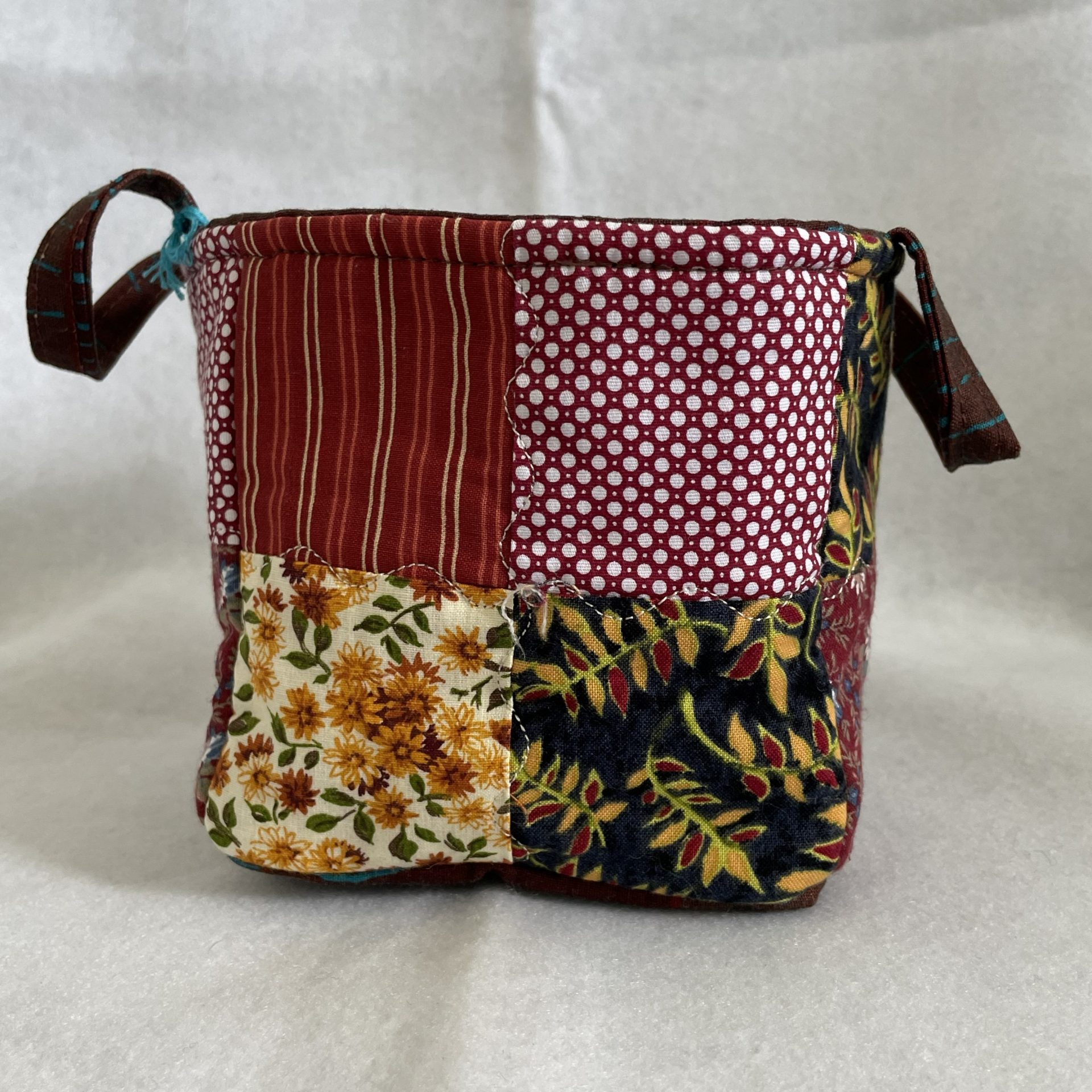 Hermosa canasta de tela hecha a mano con cuadros de telas otoñales.