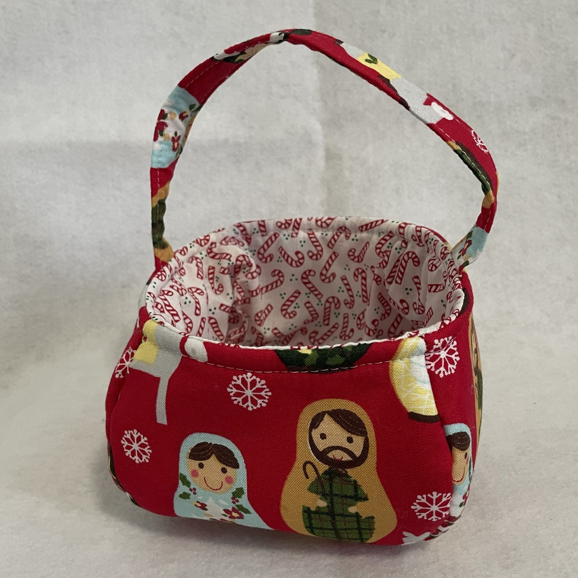 Hermosa canasta de tela hecha a mano con telas navideñas.