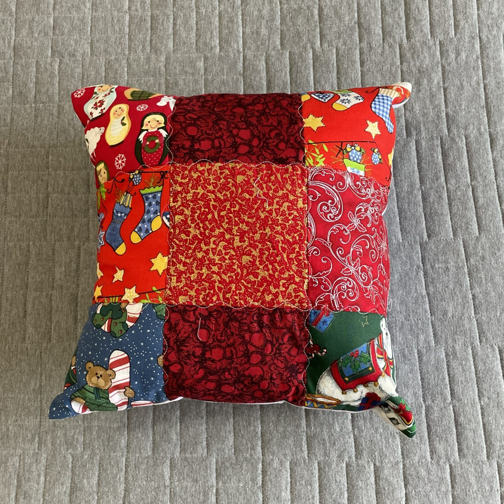 Hermoso cojín hecho a mano con parches de telas navideñas.