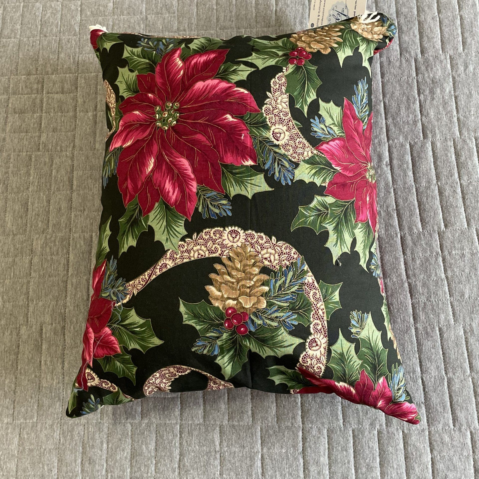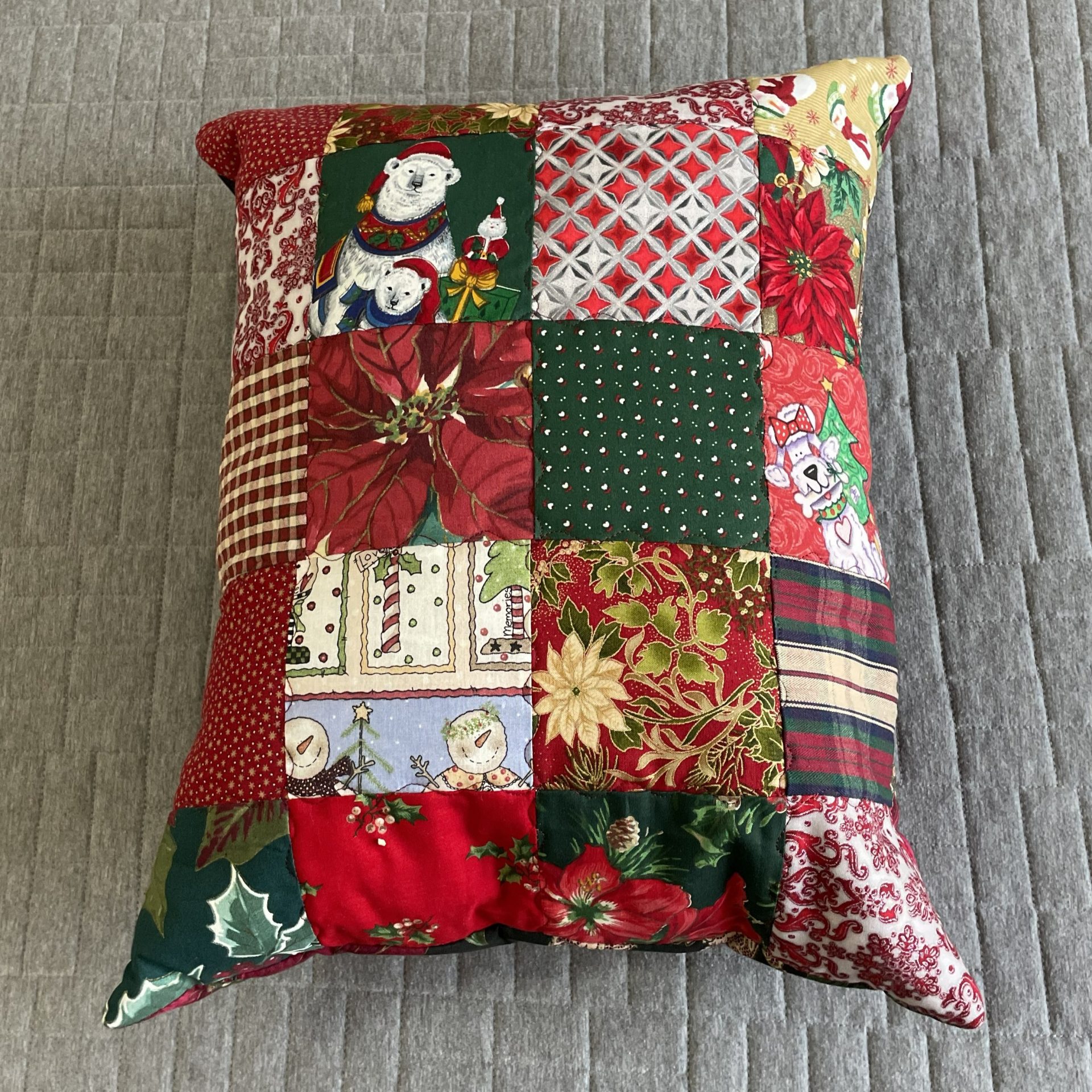 Hermoso cojín hecho a mano con parches de telas navideñas.