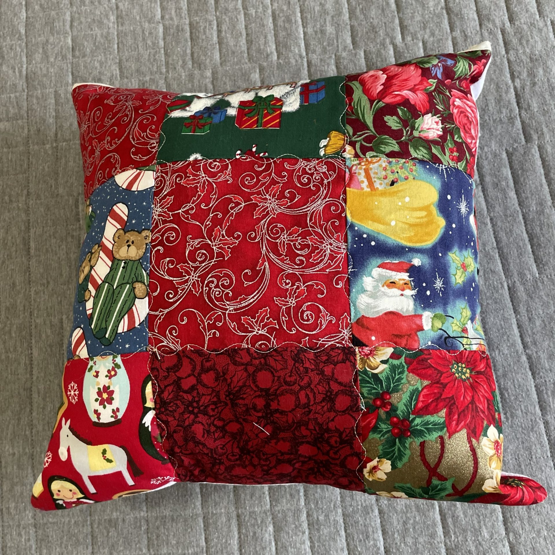 Hermoso cojín hecho a mano con parches de telas navideñas.