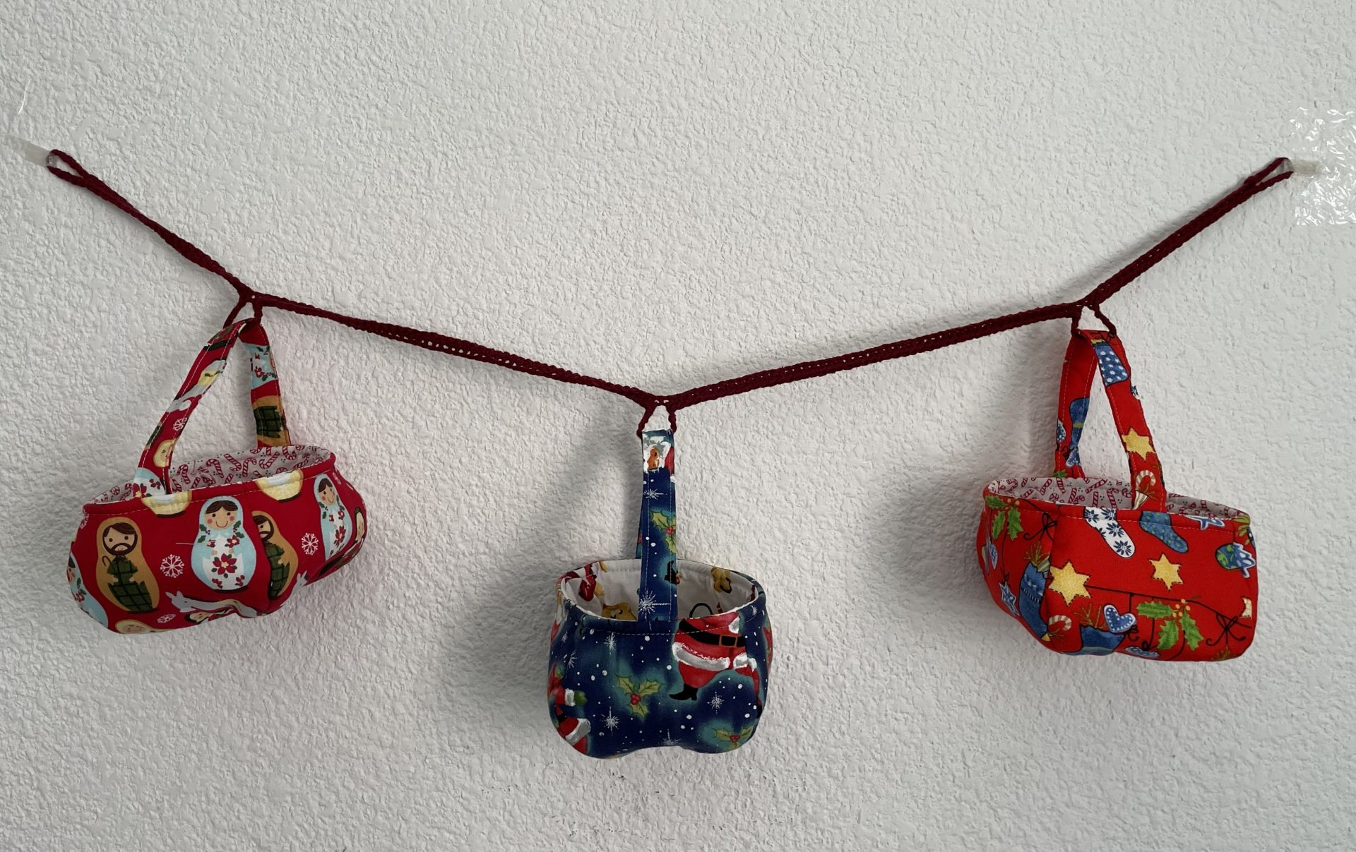 Hermoso colgante navideño hecho con 3 canastitas de tela hechas a mano.