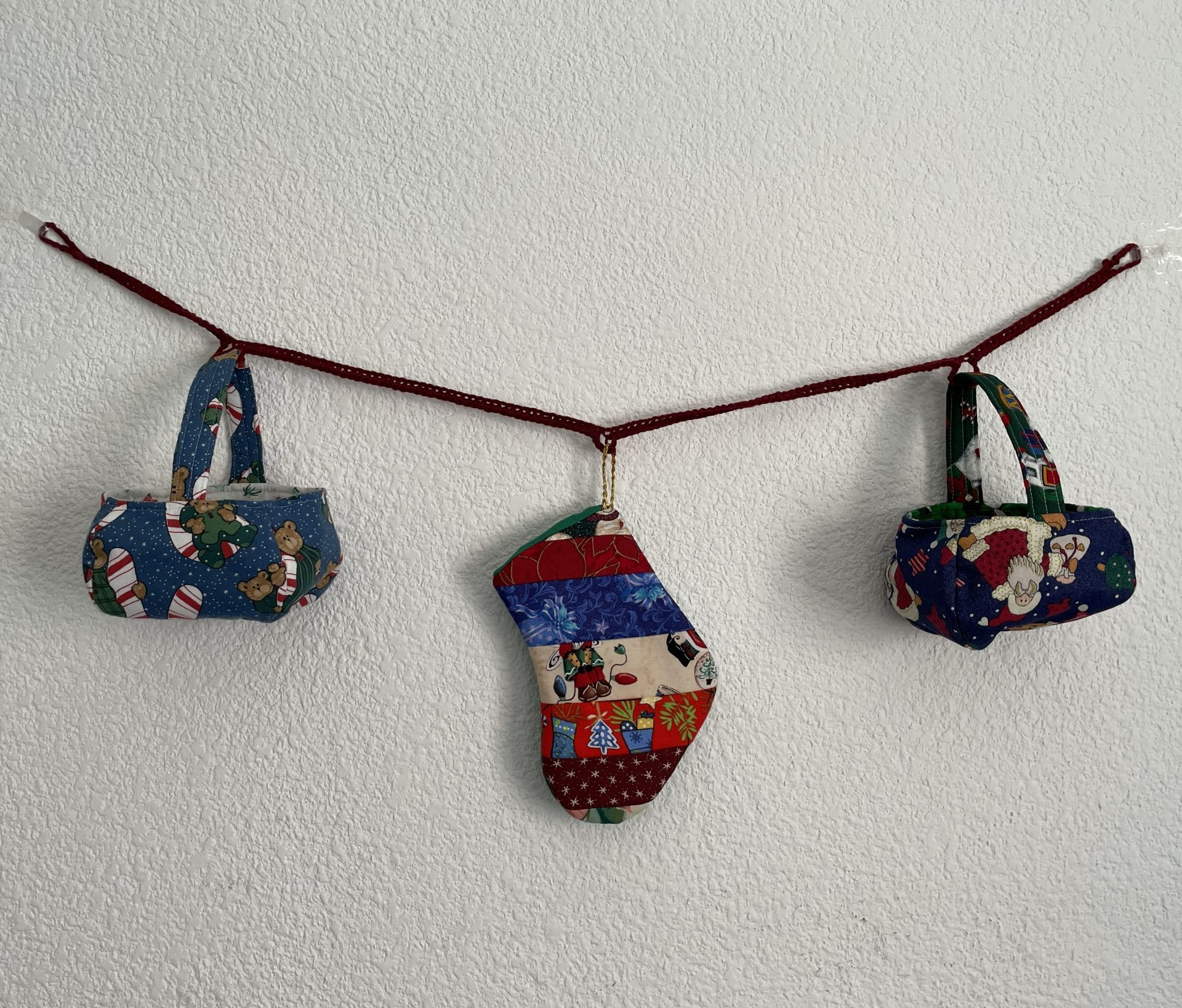 Hermoso colgante navideño hecho con 2 canastitas y 1 botita de tela hechas a mano.