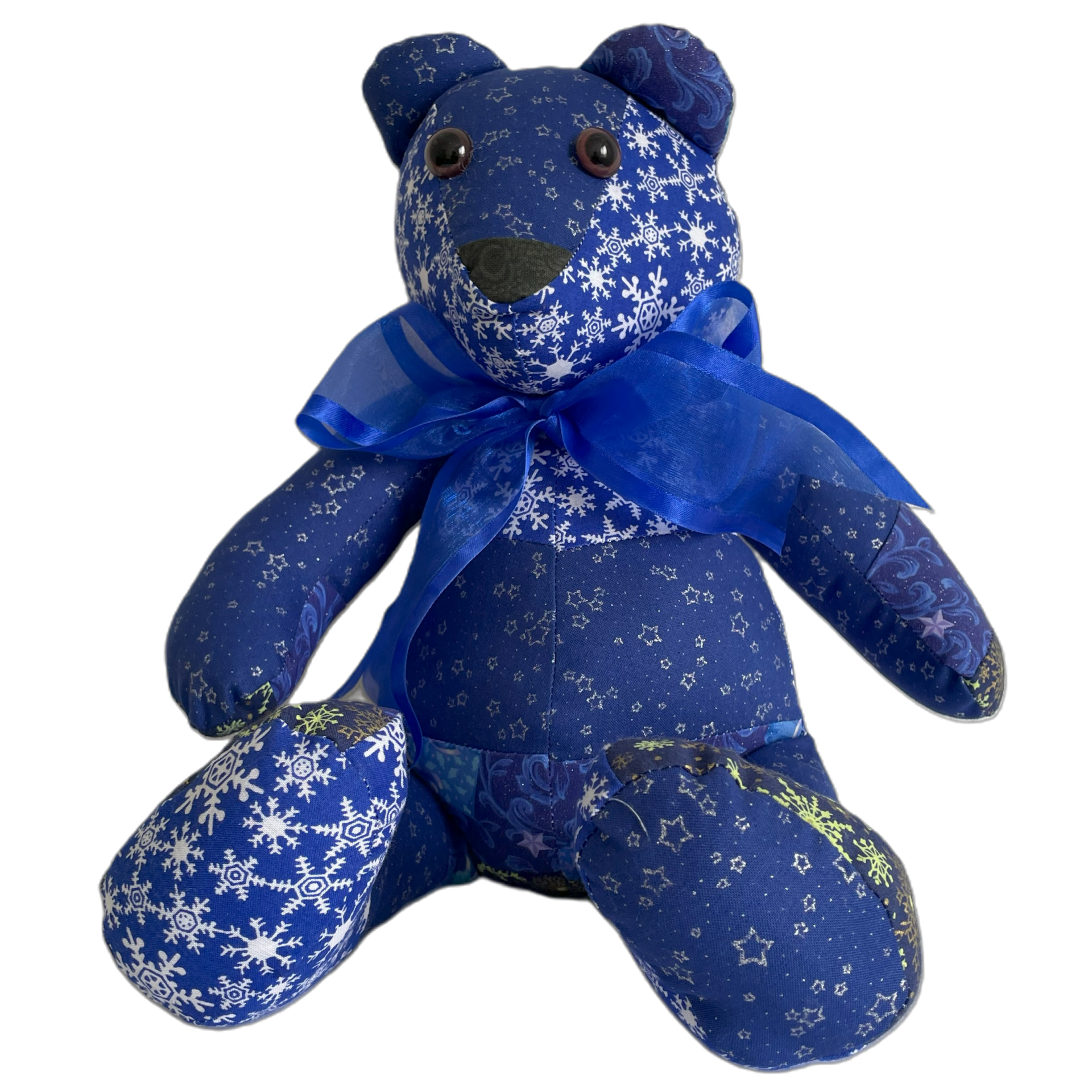 Hermoso oso hecho a mano con parches de telas navideñas.