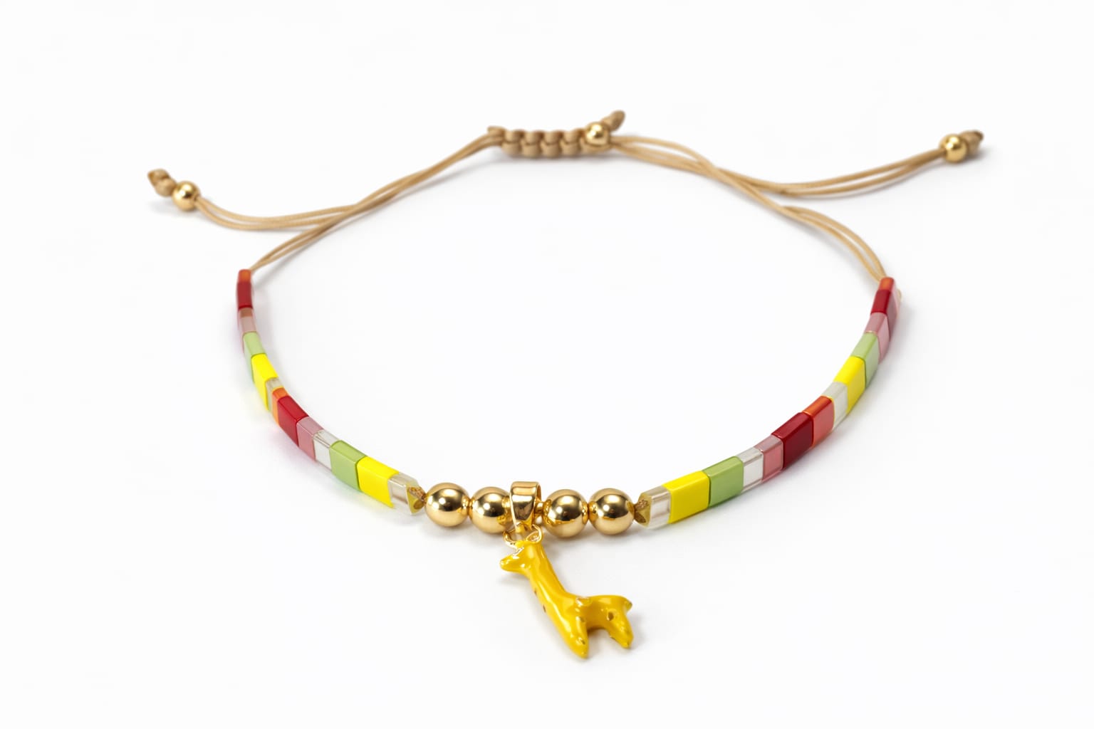 Hermosa pulsera de tilas en tonos pastel con una figura de jirafa al centrol