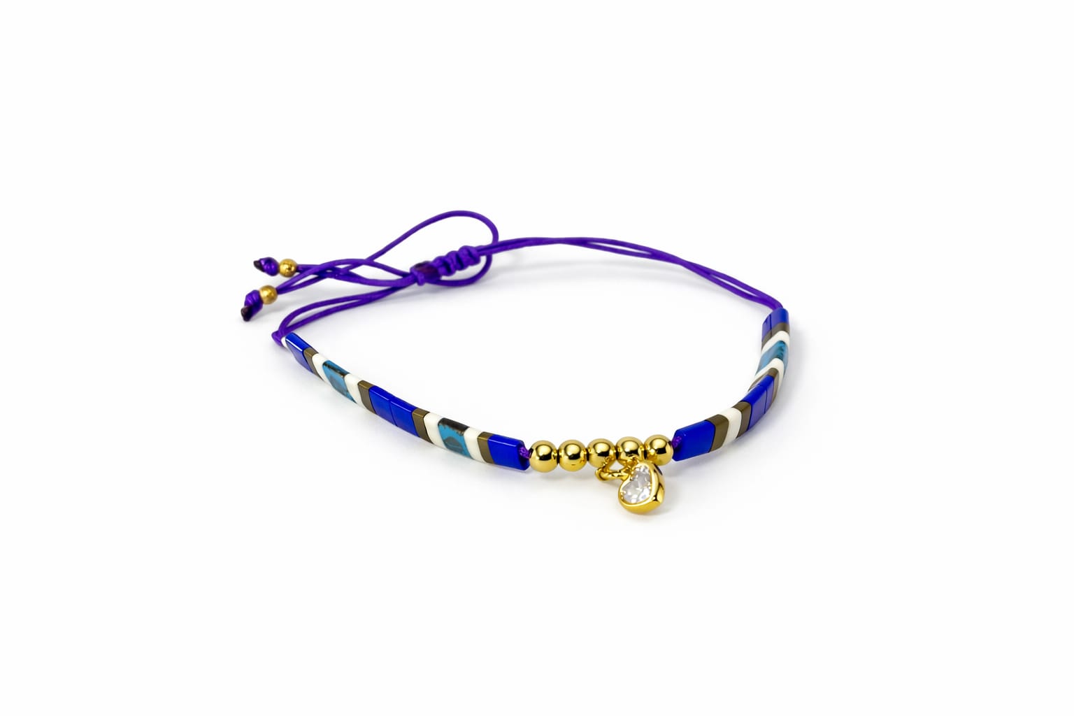Hermosa pulsera de tilas en tonos azules con dorado con una zirconia blanca en forma de corazón al centrol