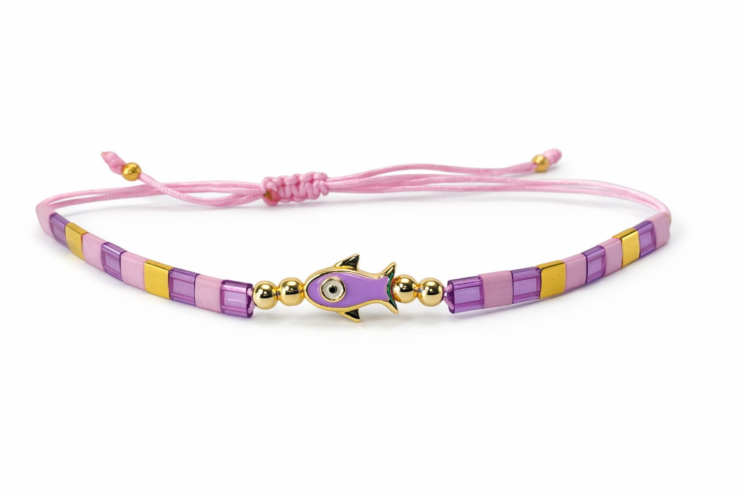 Hermosa pulsera de tilas en tonos pastel con un pez al centrol