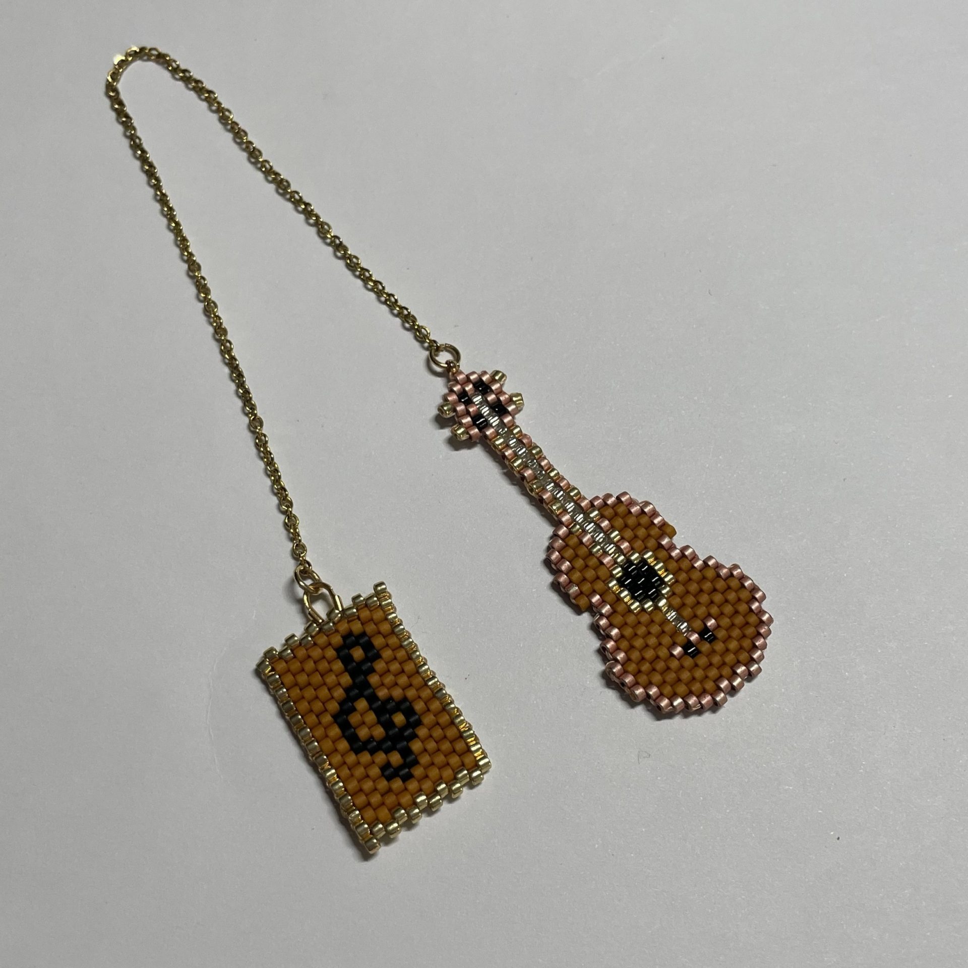 Hermoso y original separador para libro tejido con miyuki. De un lado una guitarra y del otro un llave de Sol. Harán lucir tu libro elegante y muy original.