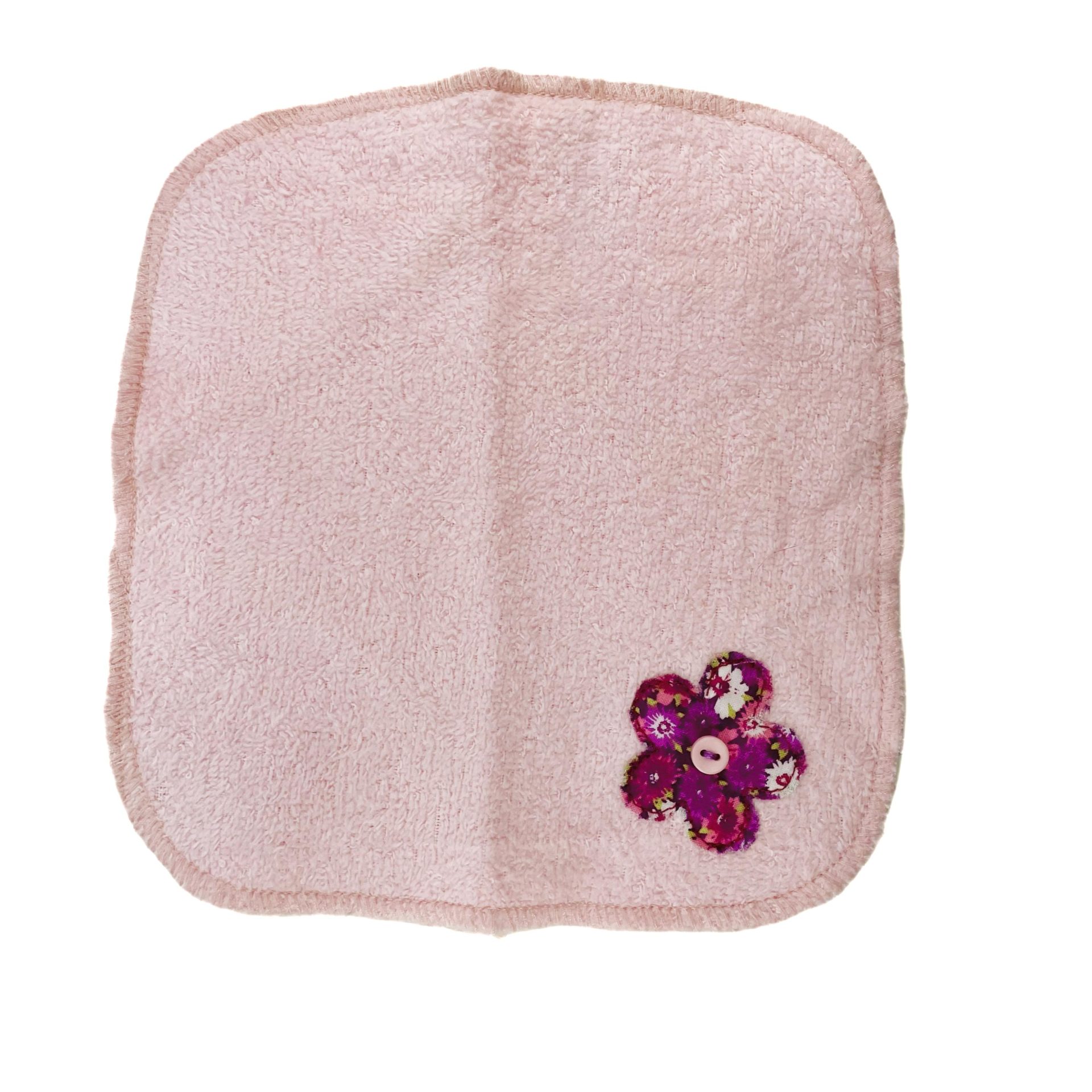 Hermosa toalla facial color rosa pastel con una hermosa aplicación de tela en forma de flor.